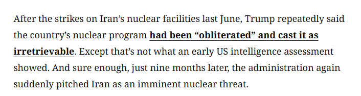 文章認為,去年6月美國轟炸伊朗核設(shè)施后,美國政府多次宣稱伊朗的核計劃已被“徹底摧毀”,“已無法挽回”。然而,美國當時的一份情報評估顯示事實并非如此。果然,僅僅九個月后,美國政府又突然將伊朗描繪成“迫在眉睫的核威脅”。