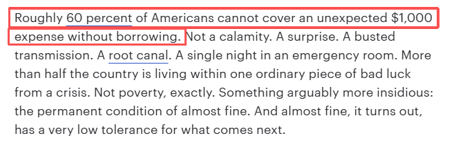 文章介紹,約60%的美國人若遭遇1000美元的意外開支,就不得不舉債應(yīng)對。不是天災(zāi),只是尋常意外,比如變速箱損壞、牙齒根管治療、急診室留觀一晚等等。美國超半數(shù)國民距離經(jīng)濟危機,只差一次厄運的降臨。這算不上真正的貧困,卻是一種更隱蔽的困境——永遠(yuǎn)在溫飽線上掙扎。而現(xiàn)實證明,這種處境根本經(jīng)不起任何風(fēng)吹草動。