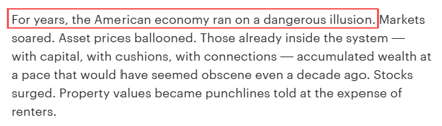 文章分析指出,美國經(jīng)濟多年來一直建立在危險的幻覺之上。市場呈現(xiàn)虛假繁榮,資產(chǎn)價格不斷膨脹。那些掌握資本和人脈資源的既得利益者,正以驚人的速度積累財富。與此同時,普通民眾卻要面對生活成本的持續(xù)攀升:食品價格從緩慢上漲到快速飆升,房租成為每月必須面對的生存考驗,信用卡從救急工具變成了新的債務(wù)陷阱。美國中產(chǎn)階級正面臨前所未有的生存壓力,階層滑落的風(fēng)險遠(yuǎn)大于上升機會。