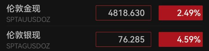 國際貴金屬市場并未因?;鹣⒍禍?,反而顯著走高。截至8日13:00,倫敦金現(xiàn)盤中大漲超過3%,再度漲超4850美元/盎司;國際銀價(jià)大漲,倫敦銀現(xiàn)盤中漲幅近6%,突破77美元/盎司。