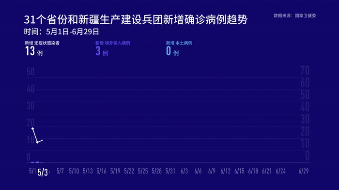 6月29日0—24時,31個省(自治區(qū)、直轄市)和新疆生產(chǎn)建設(shè)兵團報告新增確診病例19例,其中境外輸入病例11例(廣東4例,上海3例,四川3例,甘肅1例),本土病例8例(北京7例,上海1例);無新增死亡病例;新增疑似病例1例,為境外輸入病例(在上海)。