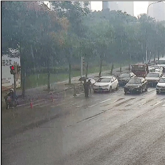 當(dāng)老人好不容易快走到馬路對(duì)面時(shí),天公不作美,突然下起瓢潑大雨,又一幕感人的瞬間出現(xiàn)了:一輛等候通行的小轎車上下來(lái)一名女司機(jī),從后備廂拿出一把雨傘后,快步跑上前,遞到老人手里。