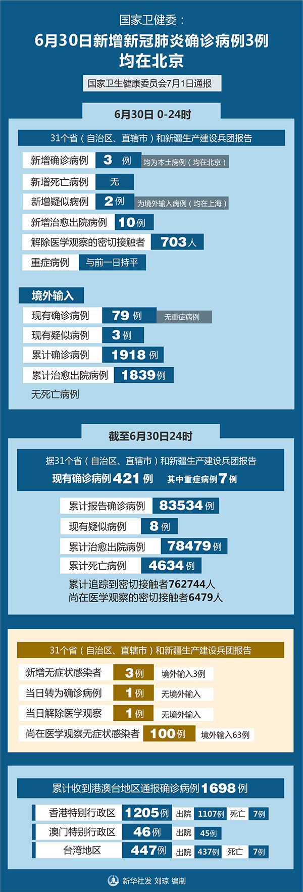 截至6月30日24時,據31個省(自治區(qū)、直轄市)和新疆生產建設兵團報告,現(xiàn)有確診病例421例(其中重癥病例7例),累計治愈出院病例78479例,累計死亡病例4634例,累計報告確診病例83534例,現(xiàn)有疑似病例8例。累計追蹤到密切接觸者762744人,尚在醫(yī)學觀察的密切接觸者6479人。