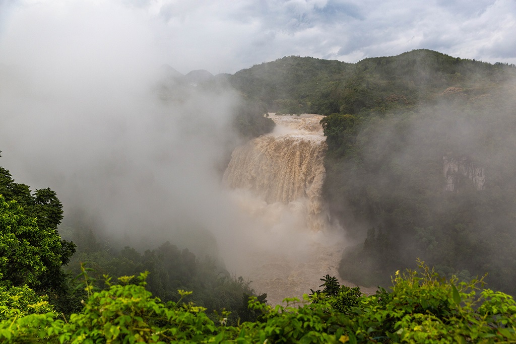 受強(qiáng)降雨影響,貴州黃果樹瀑布迎來2020年入汛以來最大水量,黃果樹瀑布水勢(shì)磅礴。陳熙/攝