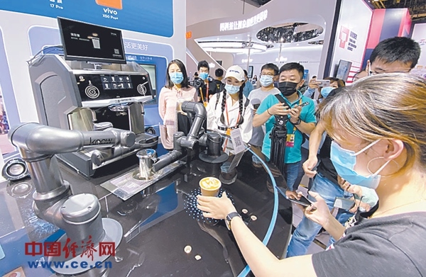 在綜合展區(qū)高通展臺(tái),觀眾們排隊(duì)體驗(yàn)機(jī)器人制作的拉花咖啡。經(jīng)濟(jì)日?qǐng)?bào)-中國(guó)經(jīng)濟(jì)網(wǎng)記者袁勇攝