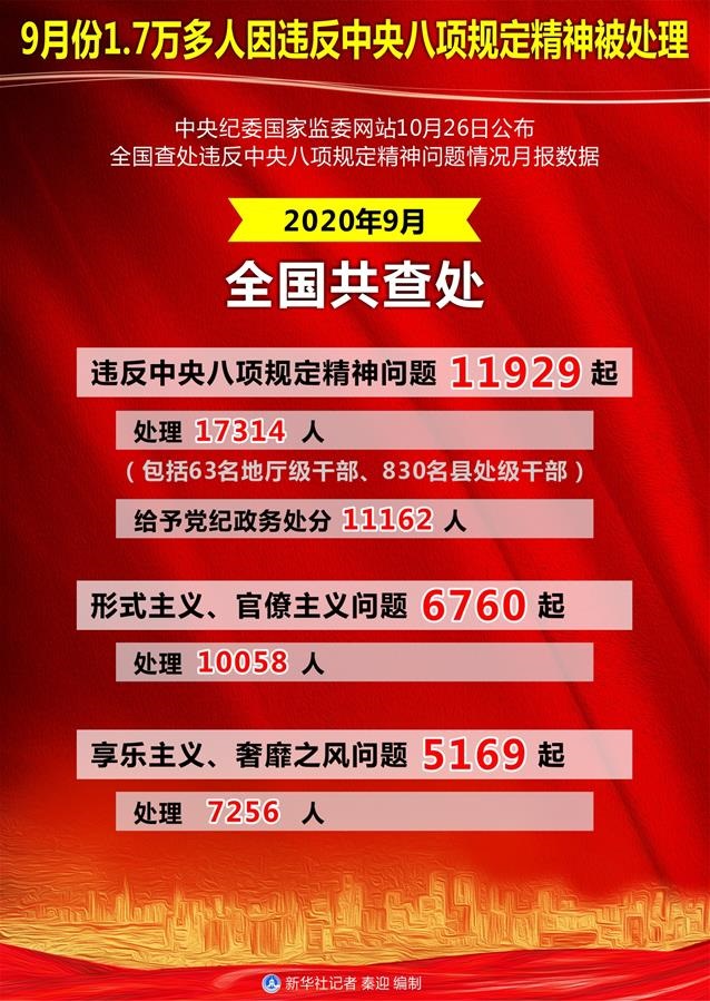 新華社北京10月26日電(記者朱基釵、孫少龍)中央紀(jì)委國家監(jiān)委網(wǎng)站26日公布全國查處違反中央八項(xiàng)規(guī)定精神問題情況月報(bào)數(shù)據(jù)。通報(bào)顯示,2020年9月,全國共查處違反中央八項(xiàng)規(guī)定精神問題11929起,處理17314人(包括63名地廳級(jí)干部、830名縣處級(jí)干部),給予黨紀(jì)政務(wù)處分11162人。