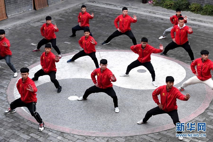學員在河南省焦作市溫縣陳家溝的一個拳館內(nèi)練拳(無人機照片,12月14日攝)。