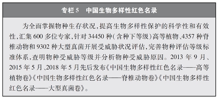 開展全國(guó)生物多樣性調(diào)查與評(píng)估。大力推進(jìn)生物多樣性保護(hù)重大工程實(shí)施,結(jié)合自然資源調(diào)查、生態(tài)系統(tǒng)監(jiān)測(cè)評(píng)估等工作,不斷完善生物多樣性調(diào)查與評(píng)估能力,首次將生物多樣性指標(biāo)納入生態(tài)質(zhì)量綜合評(píng)價(jià)指標(biāo)體系,引導(dǎo)地方加強(qiáng)生態(tài)文明建設(shè)與生物多樣性保護(hù)。開展自然資源調(diào)查,包括森林、草原、水、濕地、荒漠、海洋等,建立自然資源調(diào)查評(píng)價(jià)監(jiān)測(cè)制度。構(gòu)建了涵蓋2376個(gè)縣級(jí)行政單元、樣線總長(zhǎng)超過3.4萬(wàn)公里的物種分布數(shù)據(jù)庫(kù),建立物種資源調(diào)查及收集信息平臺(tái),準(zhǔn)確反映野生動(dòng)植物空間分布狀況。完成長(zhǎng)江經(jīng)濟(jì)帶、京津冀等國(guó)家戰(zhàn)略區(qū)域180多個(gè)縣級(jí)行政區(qū)生物多樣性調(diào)查與評(píng)估。組織開展近海漁業(yè)資源調(diào)查,初步掌握近海漁業(yè)資源狀況。陸續(xù)發(fā)布《中國(guó)植物紅皮書》《中國(guó)瀕危動(dòng)物紅皮書》《中國(guó)物種紅色名錄》《中國(guó)生物多樣性紅色名錄》,基本掌握生物多樣性總體情況,為加強(qiáng)生物多樣性保護(hù)奠定了科學(xué)基礎(chǔ)。