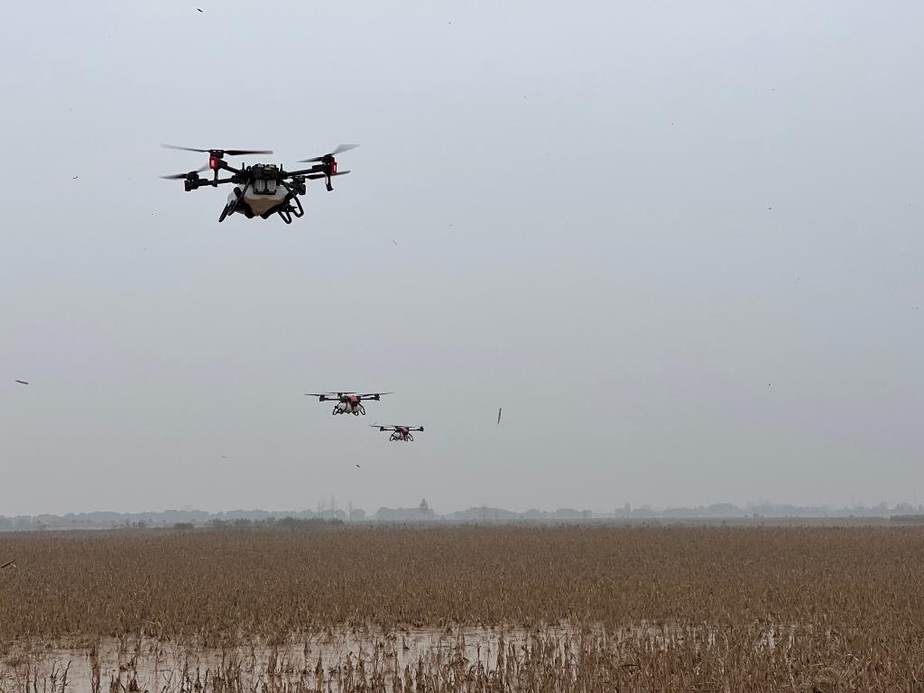 很快,渭南綠盛現(xiàn)代農(nóng)機(jī)專業(yè)合作社理事長石宇峰就帶著3臺(tái)極飛農(nóng)業(yè)無人機(jī)來到地旁,準(zhǔn)備作業(yè)。記者看到,農(nóng)業(yè)無人機(jī)全程由專業(yè)人員操作,裝種、起飛,按規(guī)劃好的線路和高度在空中播撒,種子沒了再返航續(xù)加,幾個(gè)小時(shí)就完成了飛播。