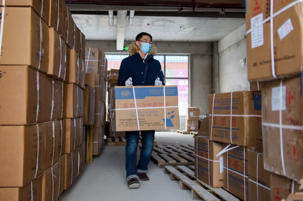 在位于滿洲里市臚臏社區(qū)的臨時物資存放點,工作人員在搬運防疫物資。新華社記者 李志鵬 攝