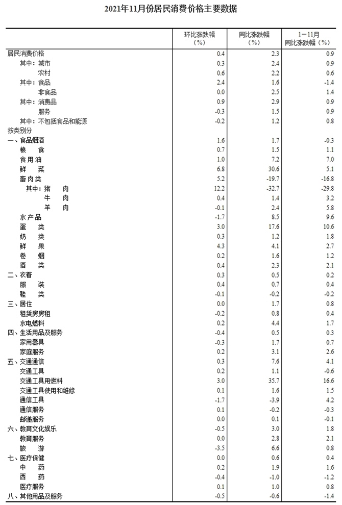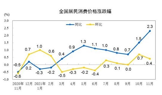 據(jù)國家統(tǒng)計(jì)局網(wǎng)站消息,2021年11月份,全國居民消費(fèi)價(jià)格同比上漲2.3%。其中,城市上漲2.4%,農(nóng)村上漲2.2%;食品價(jià)格上漲1.6%,非食品價(jià)格上漲2.5%;消費(fèi)品價(jià)格上漲2.9%,服務(wù)價(jià)格上漲1.5%。1—11月平均,全國居民消費(fèi)價(jià)格比上年同期上漲0.9%。