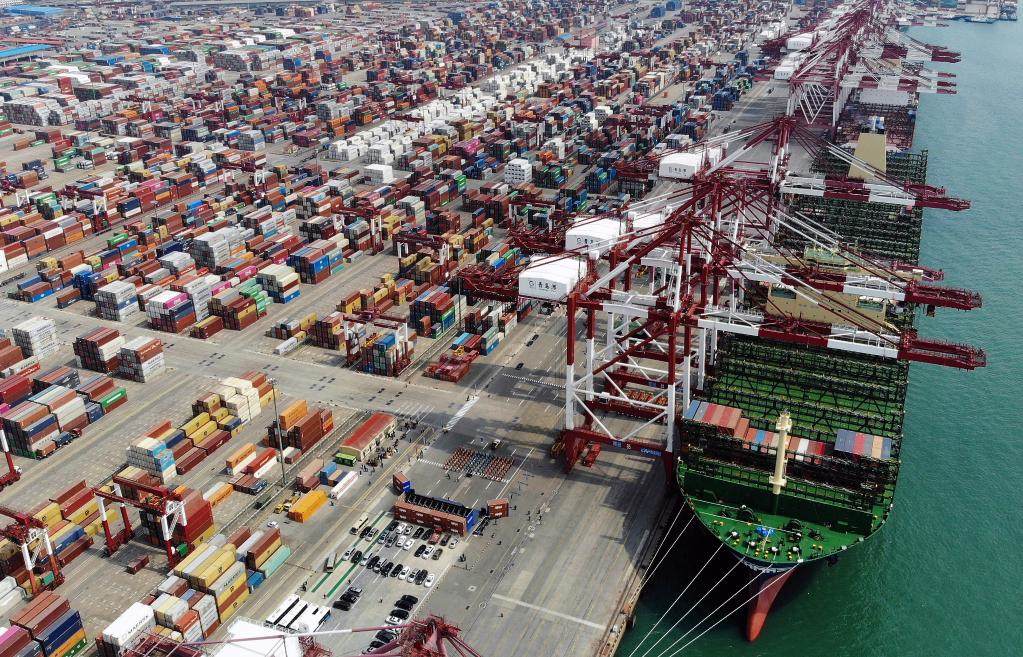 載箱量可達(dá)2.4萬(wàn)標(biāo)準(zhǔn)箱的“現(xiàn)代商船阿爾赫西拉斯”輪靠泊在青島港前灣碼頭(2020年4月26日攝,無(wú)人機(jī)照片)。(新華社記者李紫恒攝)