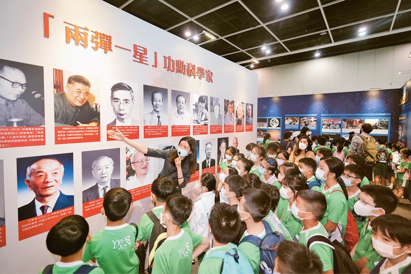 2021年6月27日至7月9日,“時(shí)代精神耀香江”之百年中國(guó)科學(xué)家主題展在香港向公眾開放。圖為7月7日,眾多小學(xué)生仔細(xì)聆聽講解員的介紹。中新社記者張煒/攝