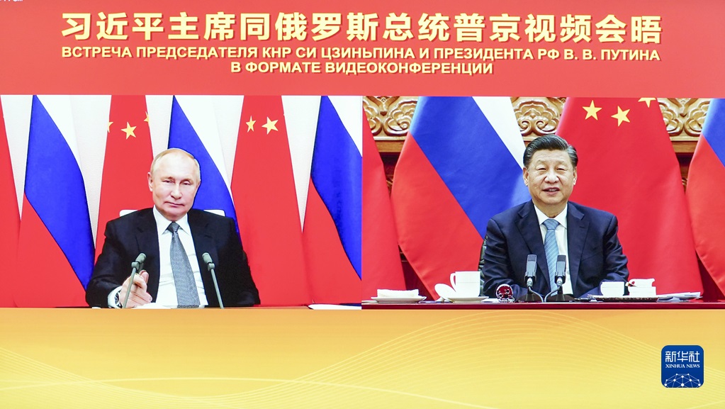這是2021年12月15日下午,國(guó)家主席習(xí)近平在北京同俄羅斯總統(tǒng)普京舉行視頻會(huì)晤。新華社記者 殷博古 攝