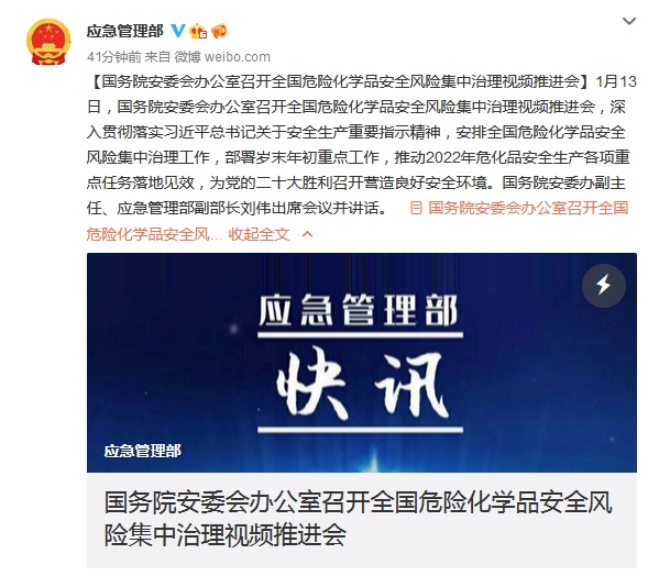 1月13日,國務(wù)院安委會辦公室召開全國危險化學品安全風險集中治理視頻推進會,安排全國危險化學品安全風險集中治理工作,部署歲末年初重點工作,推動2022年?;钒踩a(chǎn)各項重點任務(wù)落地見效,為黨的二十大勝利召開營造良好安全環(huán)境。
