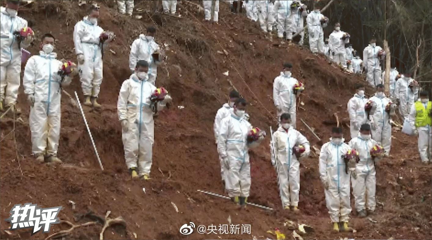 3月27日下午,“3·21”東航MU5735航空器飛行事故遇難者集體哀悼活動在事發(fā)地搜救現(xiàn)場舉行。全場鳴笛,國家應(yīng)急處置指揮部全體人員、事故現(xiàn)場搜救人員等面向遇難飛機方向肅穆而立,默哀三分鐘,以此寄托對遇難者的哀思。