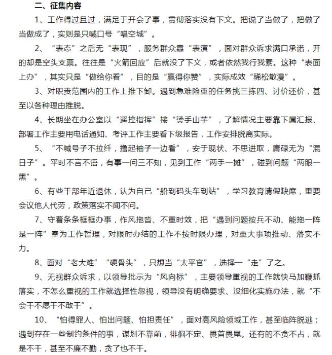 “躺平式干部”線索的征集包括10個(gè)方面,例如,“工作得過(guò)且過(guò),滿足于開(kāi)會(huì)了事”,“‘表態(tài)’之后無(wú)‘表現(xiàn)’,服務(wù)群眾靠‘表演’”,“平時(shí)不言不語(yǔ),有事一問(wèn)三不知”,等等。