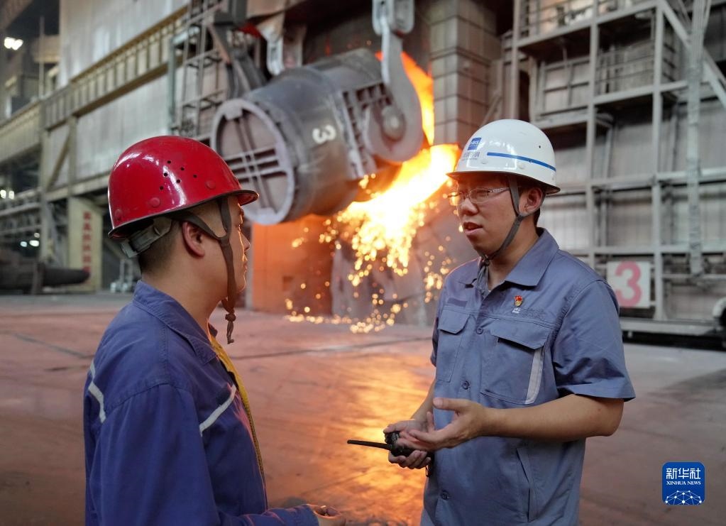 邯寶煉鋼廠特檔技術主管、轉(zhuǎn)爐車間副主任唐笑宇(右)在轉(zhuǎn)爐車間與工友交流(2022年9月7日攝)。新華社記者 楊世堯 攝