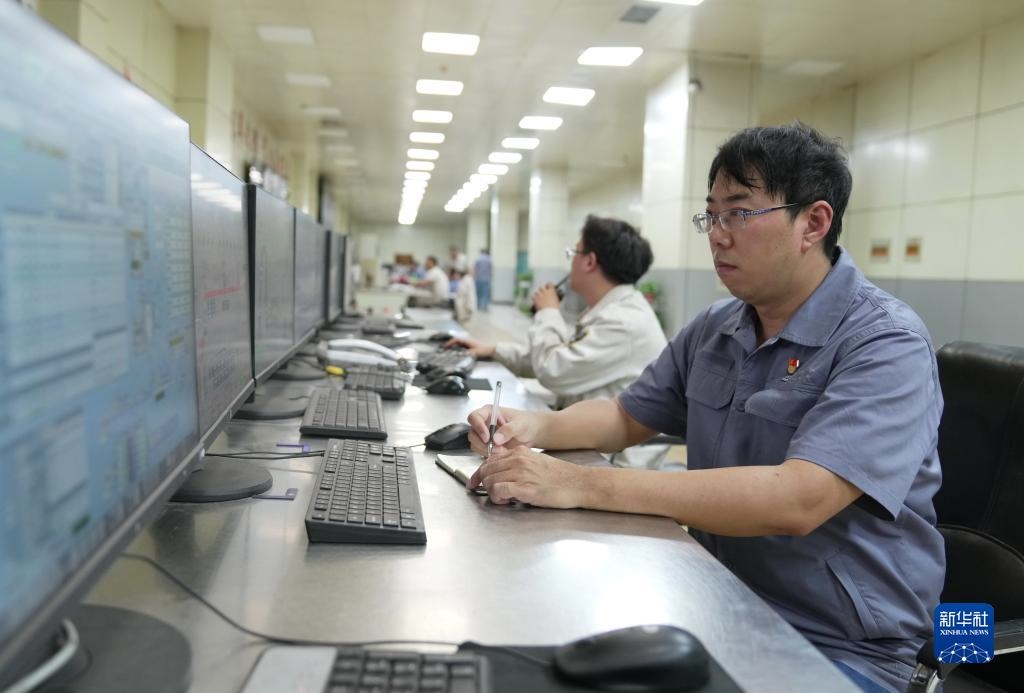 邯寶煉鋼廠特檔技術主管、轉(zhuǎn)爐車間副主任唐笑宇(右)在轉(zhuǎn)爐車間控制室工作(2022年9月7日攝)。新華社記者 楊世堯 攝