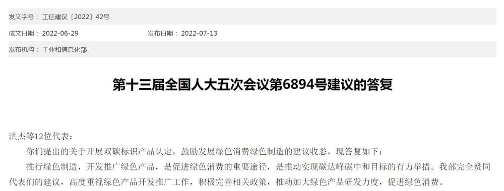 在答復(fù)中,工信部表示,推行綠色制造,開發(fā)推廣綠色產(chǎn)品,是促進(jìn)綠色消費的重要途徑,是推動實現(xiàn)碳達(dá)峰碳中和目標(biāo)的有力舉措。工信部完全贊同代表們的建議,高度重視綠色產(chǎn)品開發(fā)推廣工作,積極完善相關(guān)政策,推動加大綠色產(chǎn)品研發(fā)力度,促進(jìn)綠色消費。