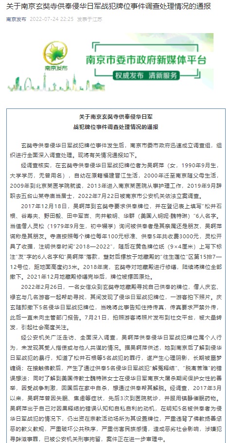 經(jīng)調(diào)查核實,在玄奘寺供奉侵華日軍戰(zhàn)犯牌位者為吳啊萍(女,1990年9月生,大學(xué)學(xué)歷,無曾用名),自幼在原籍福建晉江生活,2000年遷至南京隨父母生活,2009年到北京某醫(yī)學(xué)院就讀,2013年進(jìn)入南京某醫(yī)院從事護(hù)理工作,2019年9月辭職去五臺山某寺廟當(dāng)居士,2022年7月22日被南京市公安機關(guān)依法立案調(diào)查。
