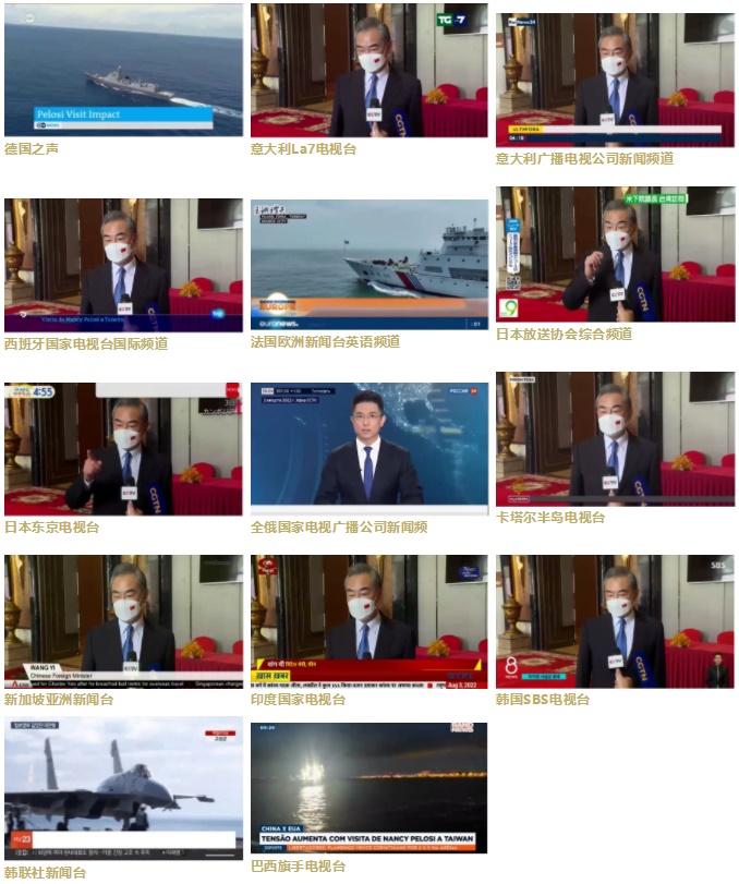 總臺(tái)亞非中心制作的外交部、全國(guó)人大常委會(huì)、中共中央臺(tái)灣工作辦公室、全國(guó)政協(xié)外事委員會(huì)、國(guó)防部、東部戰(zhàn)區(qū)、王毅國(guó)務(wù)委員兼外長(zhǎng)發(fā)表的相關(guān)聲明和談話得到了日本、韓國(guó)、印度、土耳其、印尼、伊朗等對(duì)象國(guó)250多家主流媒體轉(zhuǎn)載近5000篇次。