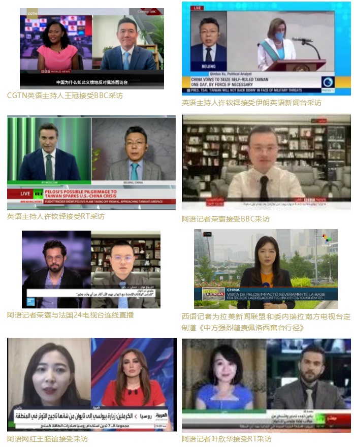 CGTN英、西、法、阿、俄等多語(yǔ)種主播、評(píng)論員和網(wǎng)紅積極在多家外媒發(fā)聲,接受了包括英國(guó)廣播公司(BBC)、今日俄羅斯(RT)、伊朗英語(yǔ)新聞臺(tái)(Press TV)、拉美新聞聯(lián)盟、貝寧E-TELE電視臺(tái)、法國(guó)24電視臺(tái)、沙特阿拉比亞電視臺(tái)以及以色列i24news電視臺(tái)等多家國(guó)際媒體的采訪連線,主動(dòng)闡釋中方立場(chǎng),分析佩洛西這一挑釁行徑背后的虛偽動(dòng)因,揭批美國(guó)在臺(tái)灣問題上“說(shuō)一套做一套”、侵犯中國(guó)的主權(quán)和領(lǐng)土完整的行為。