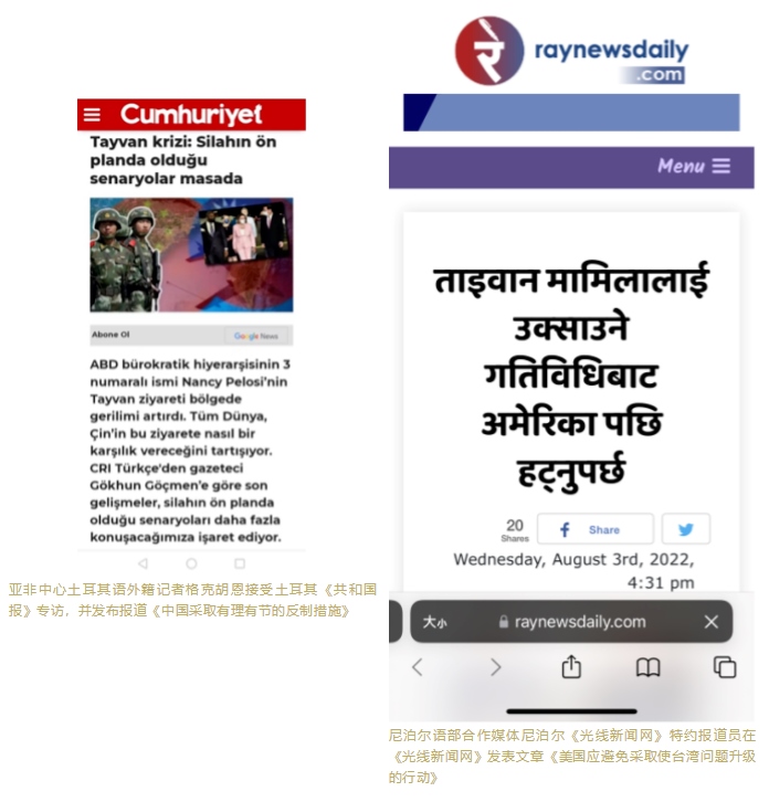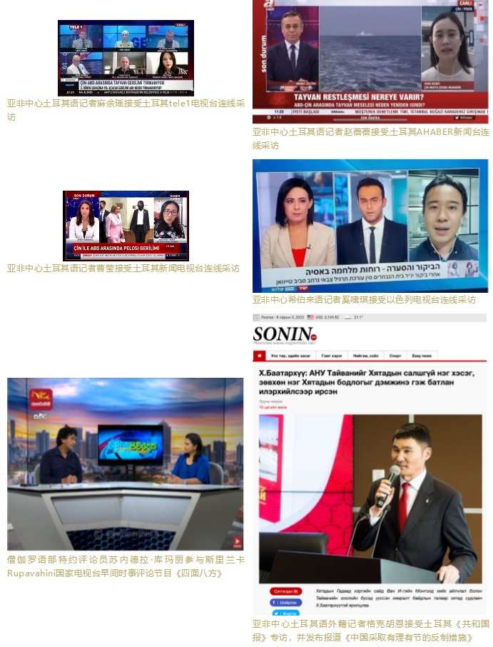 亞非中心土耳其、希伯來(lái)語(yǔ)、豪薩語(yǔ)、尼泊爾語(yǔ)、蒙古語(yǔ)等多語(yǔ)種主播、評(píng)論員和網(wǎng)紅積極在多家外媒發(fā)聲,接受了包括以色列電視臺(tái)、土耳其AHABER新聞臺(tái)、土耳其TGRT電視臺(tái)、土耳其新聞電視臺(tái)等多家國(guó)際媒體的采訪連線,同時(shí)多名外籍記者、海外特約評(píng)論員在尼日利亞《領(lǐng)導(dǎo)者報(bào)》網(wǎng)站、尼泊爾《光線新聞網(wǎng)》、肯尼亞《人民報(bào)》、蒙古國(guó)媒體SONIN.MN等對(duì)象國(guó)主流媒體發(fā)表評(píng)論及署名文章,對(duì)外闡釋中方立場(chǎng)和反制措施的合理性、正當(dāng)性,介紹臺(tái)灣問題歷史經(jīng)緯,揭批美國(guó)在臺(tái)灣問題上的背信棄義。