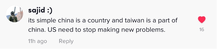 網(wǎng)友sajid:“真相很簡(jiǎn)單,臺(tái)灣是中國(guó)的一部分,美國(guó)須停止給世界帶來(lái)新的麻煩?!?/p>