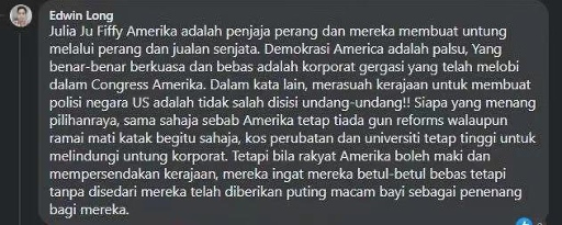 馬來(lái)西亞網(wǎng)友Edwin Long留言:“美國(guó)就是戰(zhàn)爭(zhēng)販子,他們通過戰(zhàn)爭(zhēng)和販賣武器獲利。美國(guó)的民主只是假象,真正享有權(quán)力和自由的是在幕后主導(dǎo)國(guó)會(huì)的大企業(yè)。換句話說(shuō),官商勾結(jié)在美國(guó)的法律上是被允許的!無(wú)論誰(shuí)贏得選舉,一樣不會(huì)禁槍,醫(yī)療和教育成本還是不會(huì)下降,因?yàn)橐S護(hù)大企業(yè)的利益。但是他們的人民覺得他們能罵政府就是自由的,全然沒有意識(shí)到這不過是安撫奶嘴罷了?!?/p>