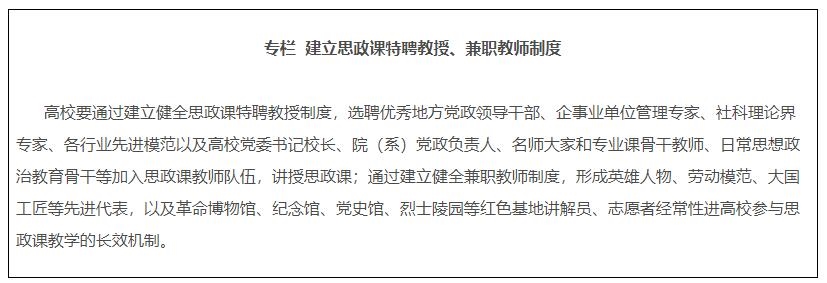 14.建設(shè)專兼結(jié)合的師資隊(duì)伍。各地各校嚴(yán)格按照要求配備建強(qiáng)高校專職思政課教師、輔導(dǎo)員隊(duì)伍,提高中小學(xué)專職思政課教師比例,實(shí)行思政課特聘教授、兼職教師制度,積極聘請黨政領(lǐng)導(dǎo)、科學(xué)家、老同志、先進(jìn)模范等擔(dān)任思政課兼職教師。深入實(shí)施馬克思主義學(xué)院院長(書記)培養(yǎng)工程,通過集中培養(yǎng)培訓(xùn)、委托重大項(xiàng)目、加強(qiáng)實(shí)踐鍛煉、開展國際國內(nèi)訪學(xué)等方式,培養(yǎng)一批青年馬克思主義理論家。