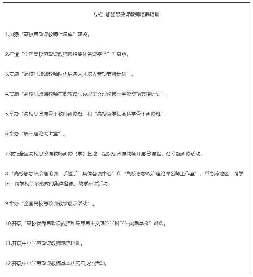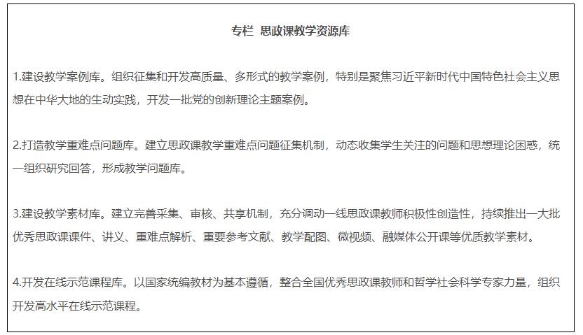 19.全面推進(jìn)課程思政高質(zhì)量建設(shè)。教育部組建高等學(xué)校課程思政教學(xué)指導(dǎo)委員會,研制普通本科專業(yè)類課程思政教學(xué)指南,組織開展高校教師課程思政教學(xué)能力培訓(xùn),建設(shè)一批課程思政系列共享資源庫。建成一批課程思政示范高校,推出一批課程思政示范課程,選樹一批課程思政教學(xué)名師和團(tuán)隊(duì),建設(shè)一批高校課程思政教學(xué)研究示范中心。加強(qiáng)中小學(xué)學(xué)科德育建設(shè)。