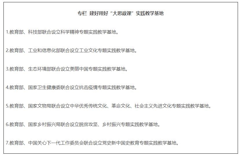 10.建好用好實(shí)踐教學(xué)基地。教育部會同有關(guān)部門,利用現(xiàn)有基地(場館),分專題設(shè)立一批“大思政課”實(shí)踐教學(xué)基地。發(fā)揮好教育部高校思政課教師研學(xué)基地的實(shí)踐教學(xué)功能。各地教育部門要結(jié)合實(shí)際,積極建設(shè)“大思政課”實(shí)踐教學(xué)基地。大中小學(xué)要主動對接各級各類實(shí)踐教學(xué)基地,開發(fā)現(xiàn)場教學(xué)專題,開展實(shí)踐教學(xué)。有條件的學(xué)??膳c有關(guān)基地建立長效合作機(jī)制,加強(qiáng)研究和資源開發(fā)。各基地要積極創(chuàng)造條件,與各地教育部門、學(xué)校建立有效工作機(jī)制,協(xié)同完成好實(shí)踐教學(xué)任務(wù)。