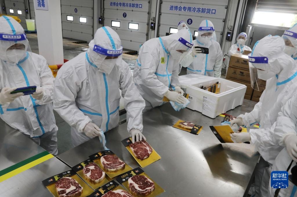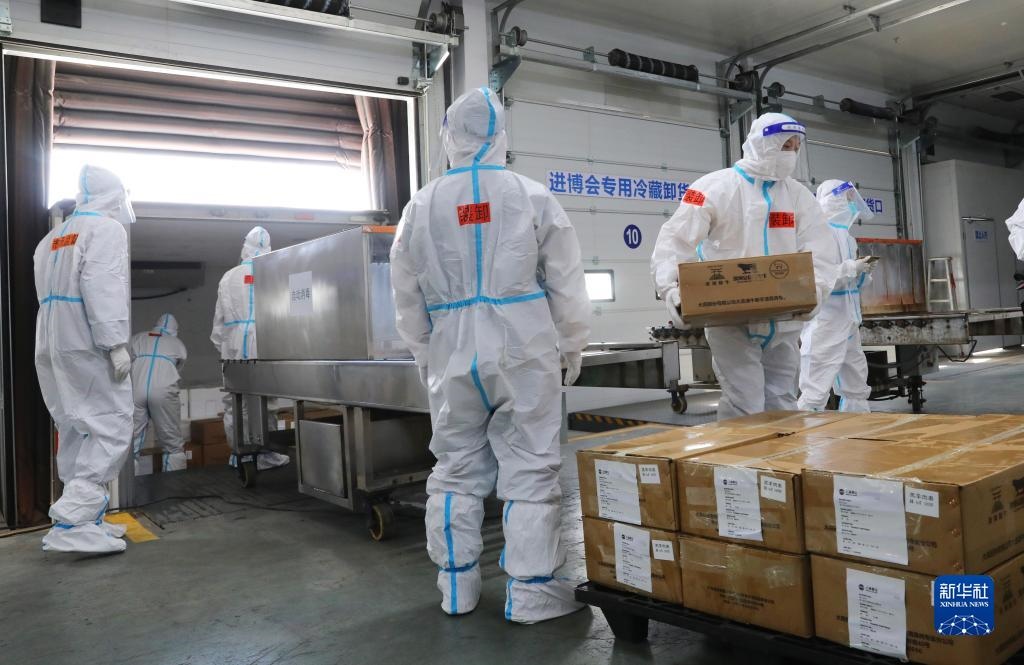 記者在現(xiàn)場看到,當(dāng)運(yùn)輸進(jìn)口冷鏈?zhǔn)称氛蛊返能囕v到達(dá)后,工作人員馬上對司機(jī)進(jìn)行健康碼核驗(yàn)和體溫檢測,并對車輛進(jìn)行消毒。裝卸過程中,司機(jī)實(shí)行“非必要不下車”。貨物入庫時(shí),在完成外包裝消毒后,工作人員將展品拆除外包裝,對內(nèi)里的小包裝進(jìn)行消毒、核酸檢測,再重新裝箱、貼標(biāo)簽、放入暫存庫,之后再轉(zhuǎn)入合格儲存庫。