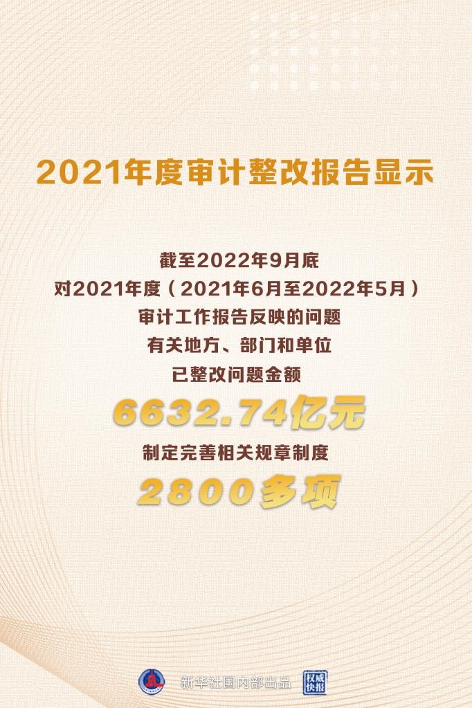 新華社北京12月28日電(記者鄒多為)報告顯示,截至2022年9月底,對于2021年度(2021年6月至2022年5月)審計工作報告反映的問題,有關(guān)地方、部門和單位已整改問題金額6632.74億元,制定完善相關(guān)規(guī)章制度2800多項(xiàng),追責(zé)問責(zé)1.4萬人,糾治了一些阻礙改革發(fā)展和長期未解決的頑瘴痼疾。