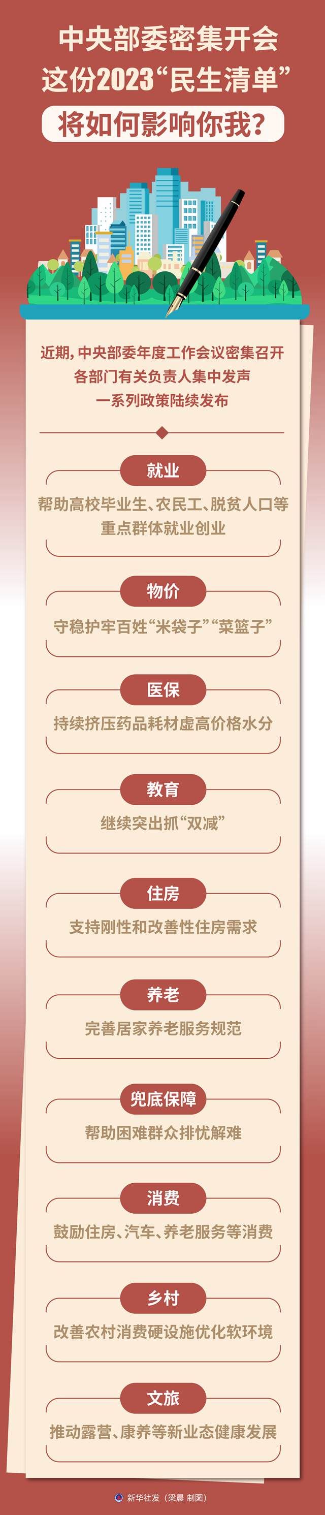近期,中央部委年度工作會議密集召開,各部門有關負責人集中發(fā)聲,一系列政策陸續(xù)發(fā)布?!靶氯A視點”記者梳理了多個領域2023年聚焦民生關切的重要舉措。