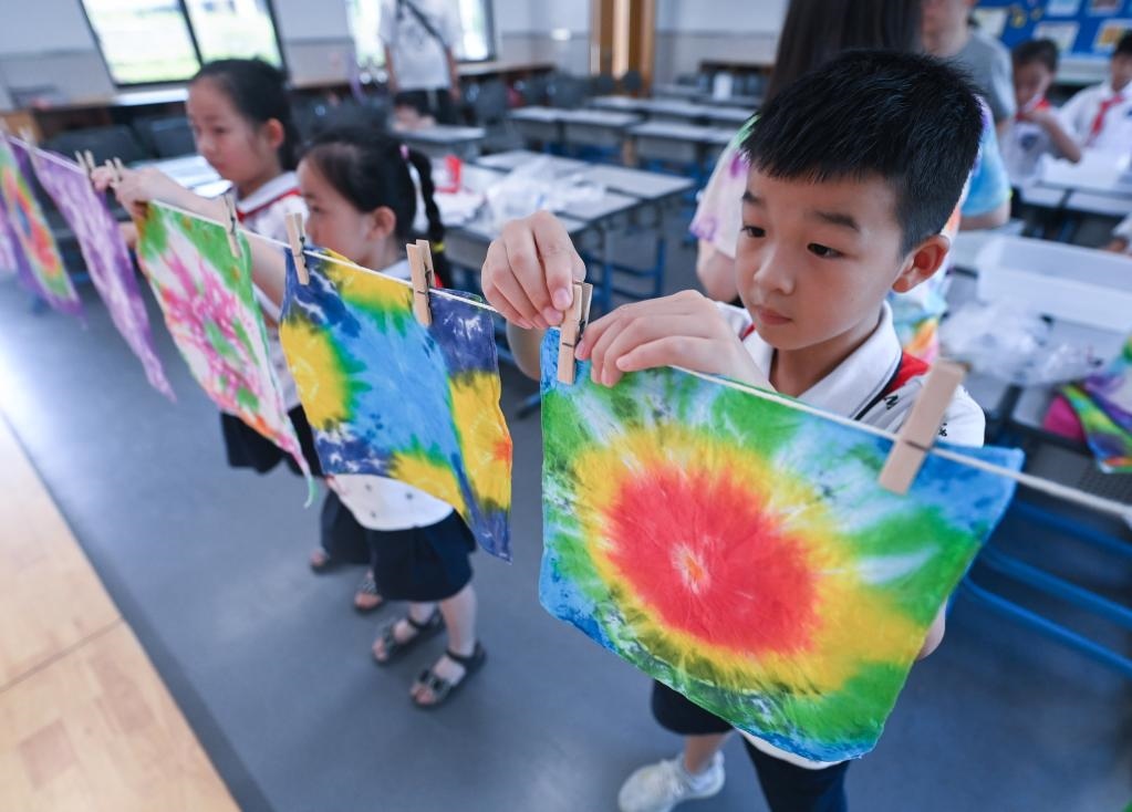 2022年8月10日,湖州市吳興實驗小學的學生把做好的扎染作品掛在教室里。新華社記者 徐昱 攝