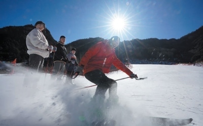 黑崖溝村開設(shè)了高山滑雪場,教練為孩子們示范滑雪動(dòng)作。