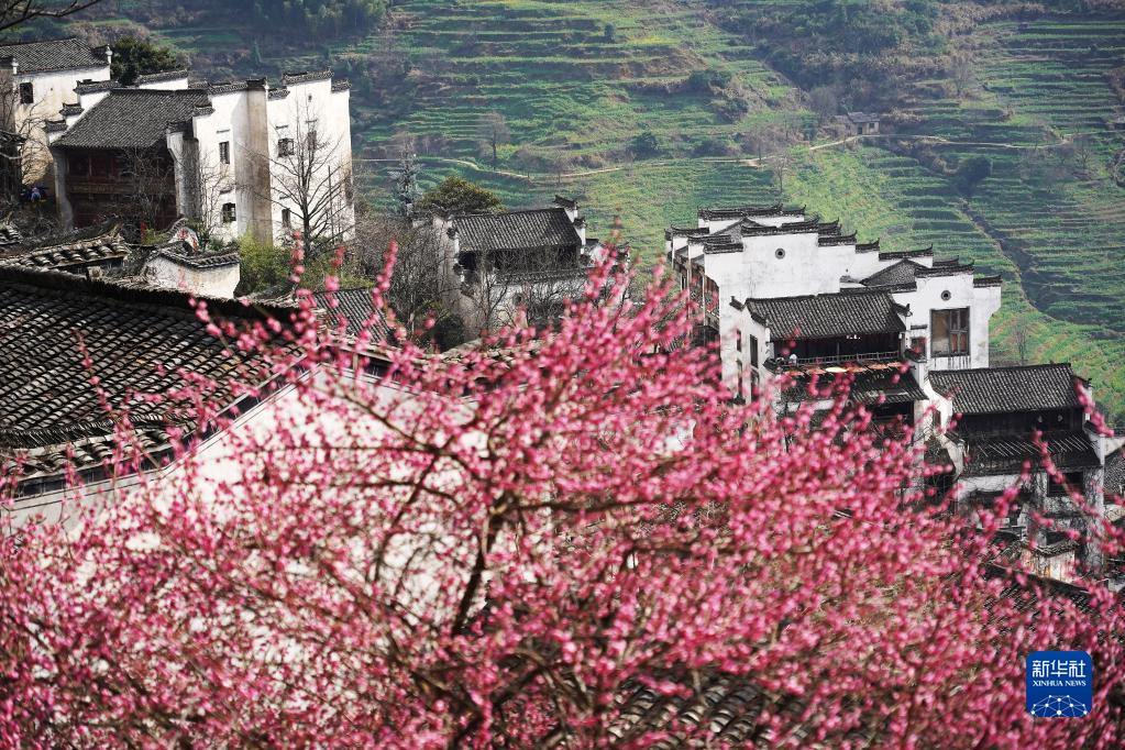 近日,隨著氣溫回暖,江西婺源迎來賞花季,花海層疊掩映在白墻黛瓦間,吸引游客前來踏青賞花,享受美好春光。