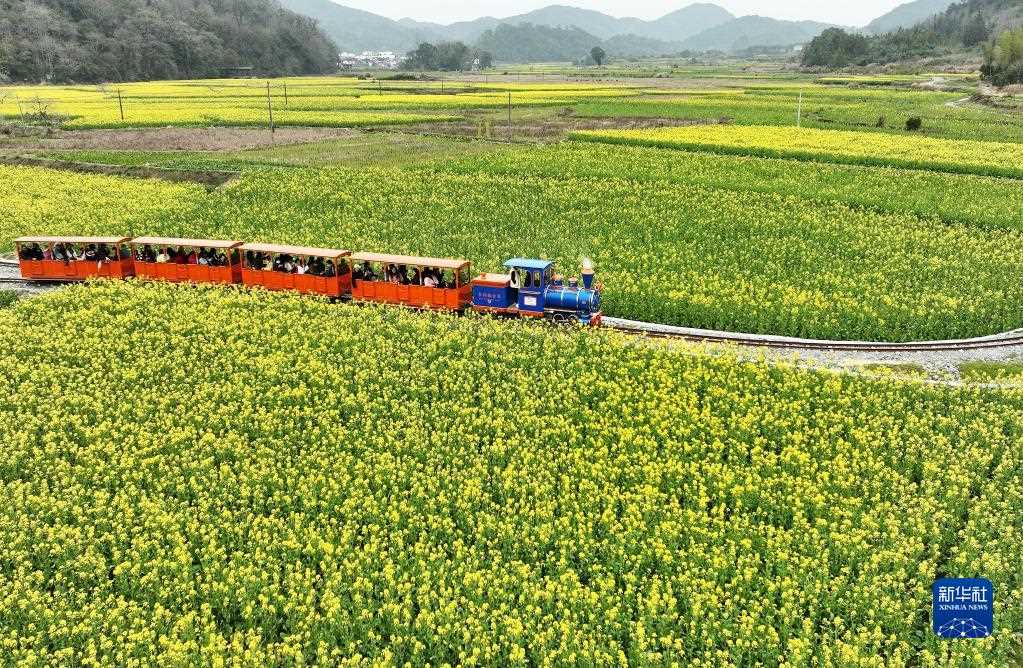 游客在江西省婺源縣嚴田景區(qū)乘坐“小火車”觀賞花海(3月3日攝,無人機照片)。