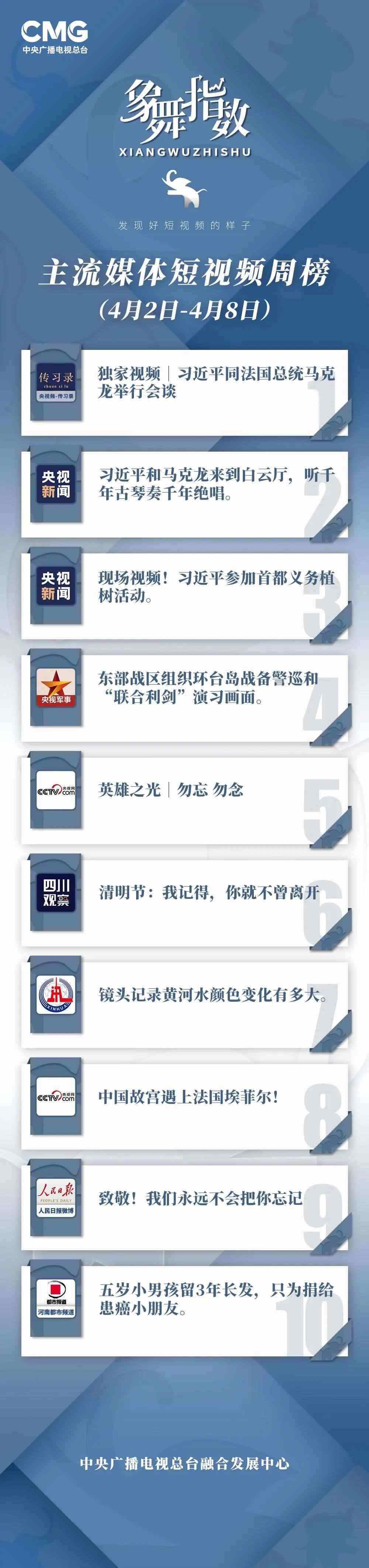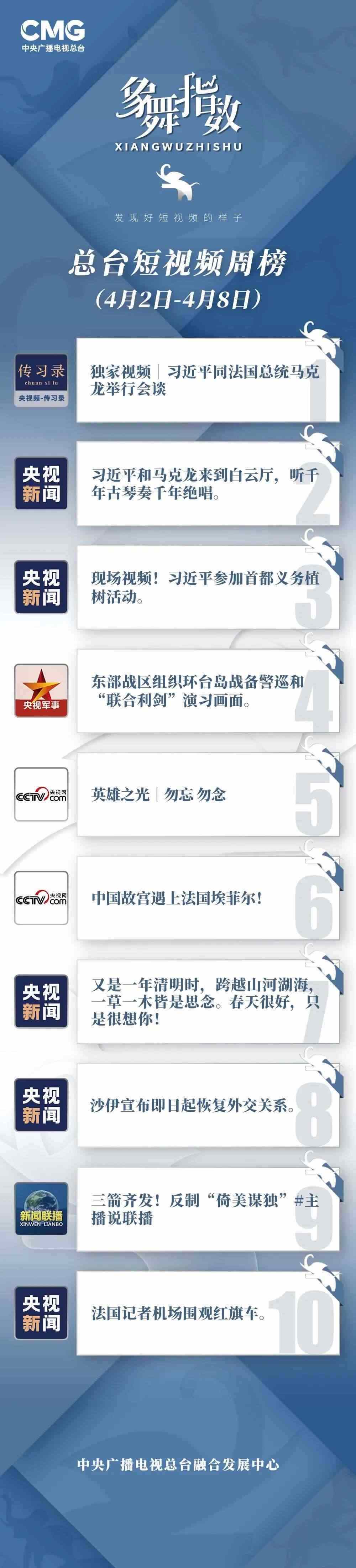 中央廣播電視總臺“象舞指數(shù)”評議品牌,推出主流媒體短視頻周榜、總臺短視頻周榜。在2023年4月2日—4月8日,這些內容引發(fā)大眾關注: