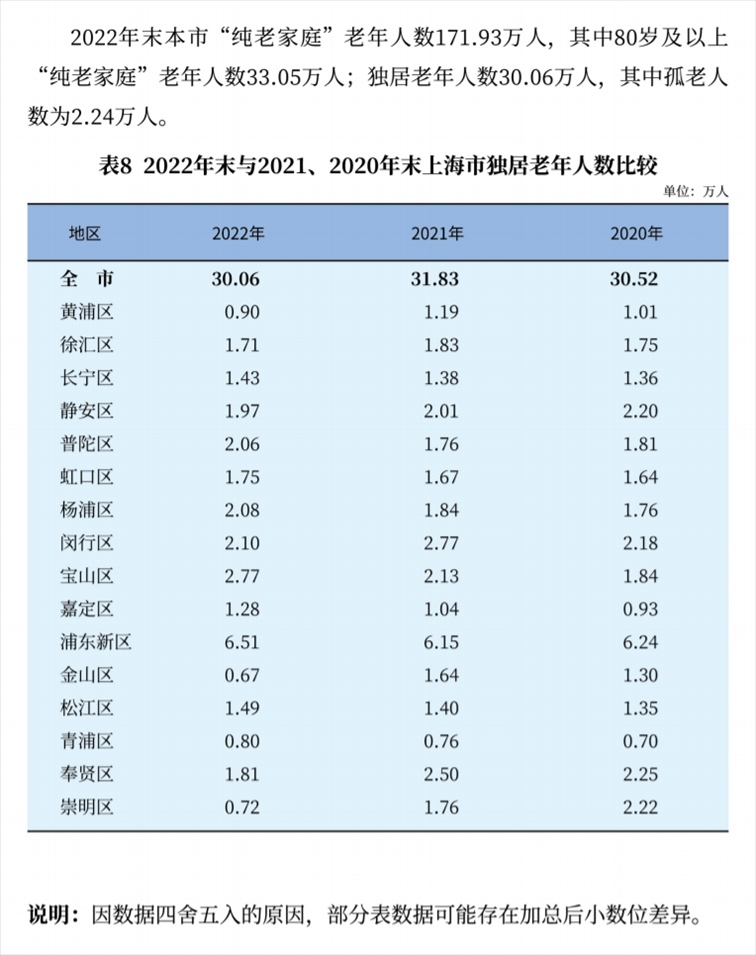 統(tǒng)計數(shù)據(jù)還顯示,2022年末,上海獨居老年人數(shù)30.06萬人,其中孤老人數(shù)為2.24萬人。