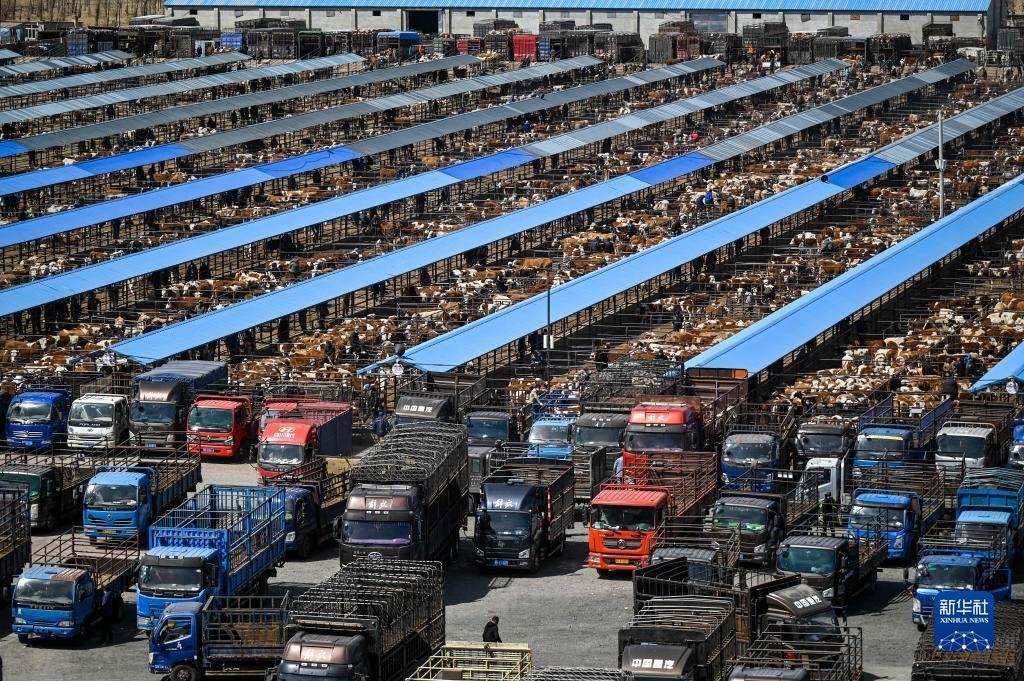 4月12日,內(nèi)蒙古通遼市科爾沁左翼中旗舍伯吐鎮(zhèn)成峰牲畜交易市場里一片繁忙景象,1000余輛貨運(yùn)車整齊排列,1萬余頭黃牛正等待被交易。據(jù)介紹,這個(gè)交易市場年交易80萬頭肉牛,交易額可達(dá)80億元。今年以來,當(dāng)?shù)嘏J行星橹饾u轉(zhuǎn)好,來自遼寧、吉林、山東等地的買家再次聚集于此,帶動(dòng)了養(yǎng)殖戶增收。新華社記者 連振 攝