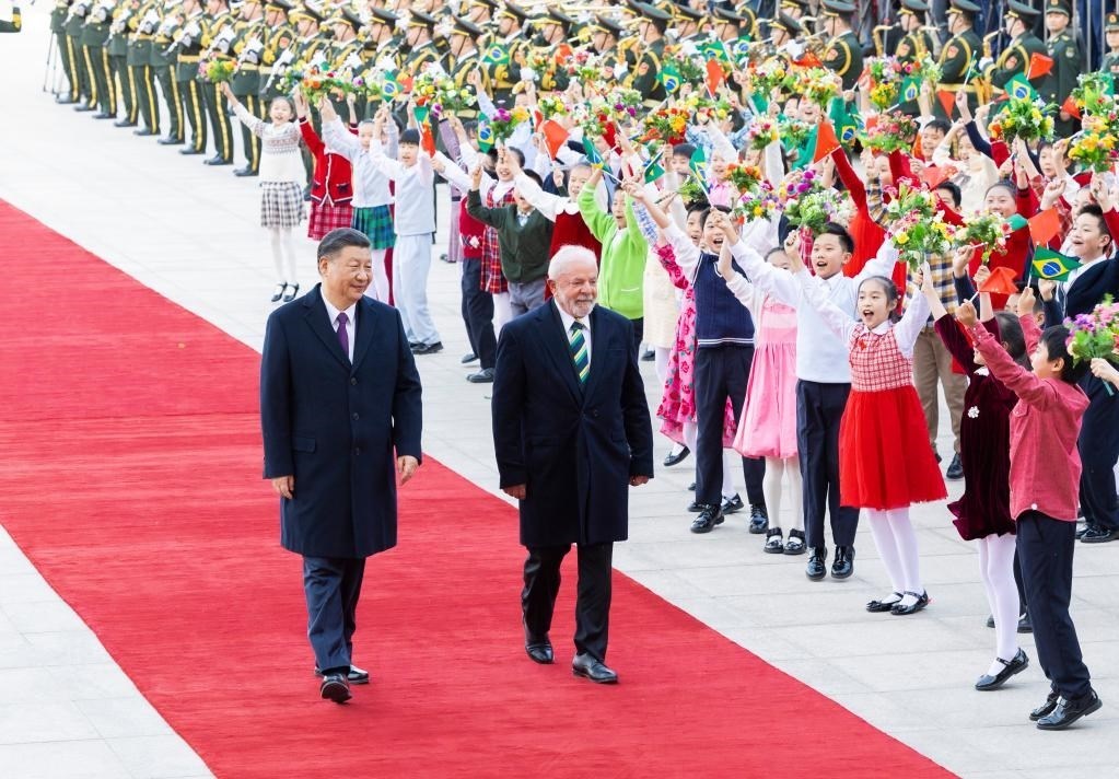 4月14日下午,國家主席習(xí)近平在北京人民大會(huì)堂同來華進(jìn)行國事訪問的巴西總統(tǒng)盧拉舉行會(huì)談。這是會(huì)談前,習(xí)近平在人民大會(huì)堂東門外廣場為盧拉舉行歡迎儀式。新華社記者 黃敬文 攝