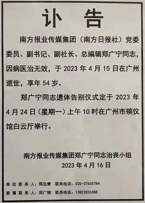 據(jù)南方報(bào)業(yè)傳媒集團(tuán)發(fā)布的訃告,南方報(bào)業(yè)傳媒集團(tuán)(南方日?qǐng)?bào)社)黨委委員、副書記、副社長(zhǎng)、總編輯鄭廣寧同志,因病醫(yī)治無(wú)效,于2023年4月15日在廣州逝世,享年54歲。