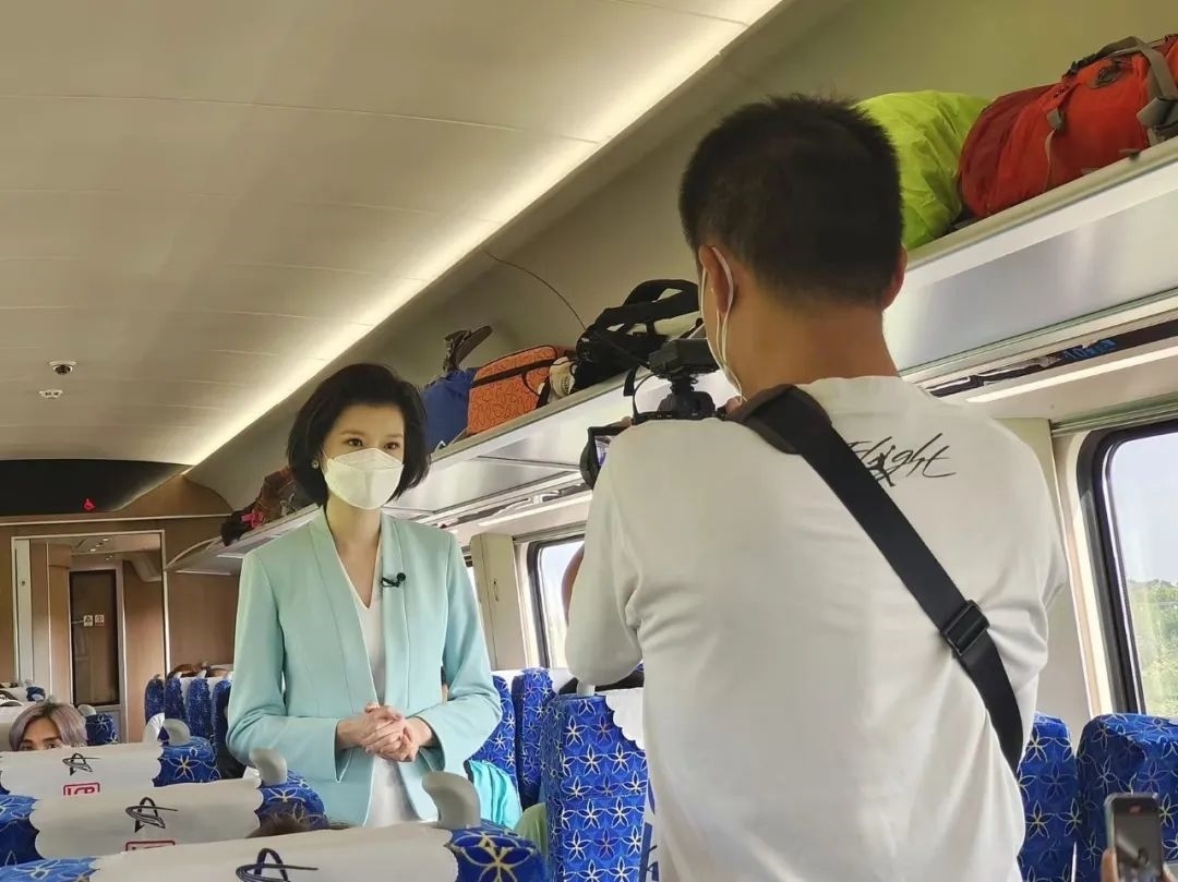 △總臺主持人鄒韻在中老鐵路“瀾滄號”動車上采訪