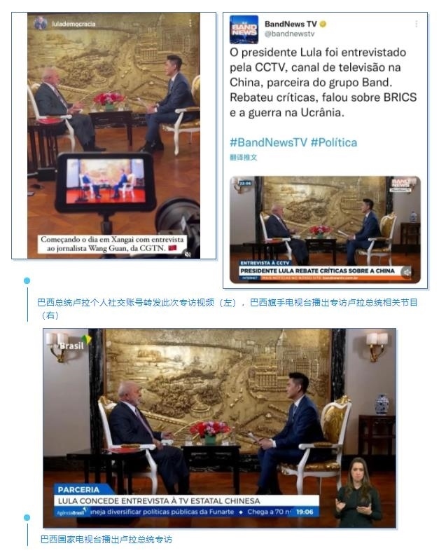 盧拉總統(tǒng)在其個人社交賬號轉(zhuǎn)發(fā)此次專訪視頻。巴西第二大電視臺旗手電視臺綜合頻道,在當(dāng)?shù)貢r間4月14日晚率先播出總臺《高端訪談》專訪盧拉總統(tǒng)的精華版,觸達巴西全境,完整版專訪于次日在該臺各頻道多次播出。巴西最大新聞門戶網(wǎng)站UOL、知名雜志《論壇》等也陸續(xù)上線本次專訪節(jié)目。