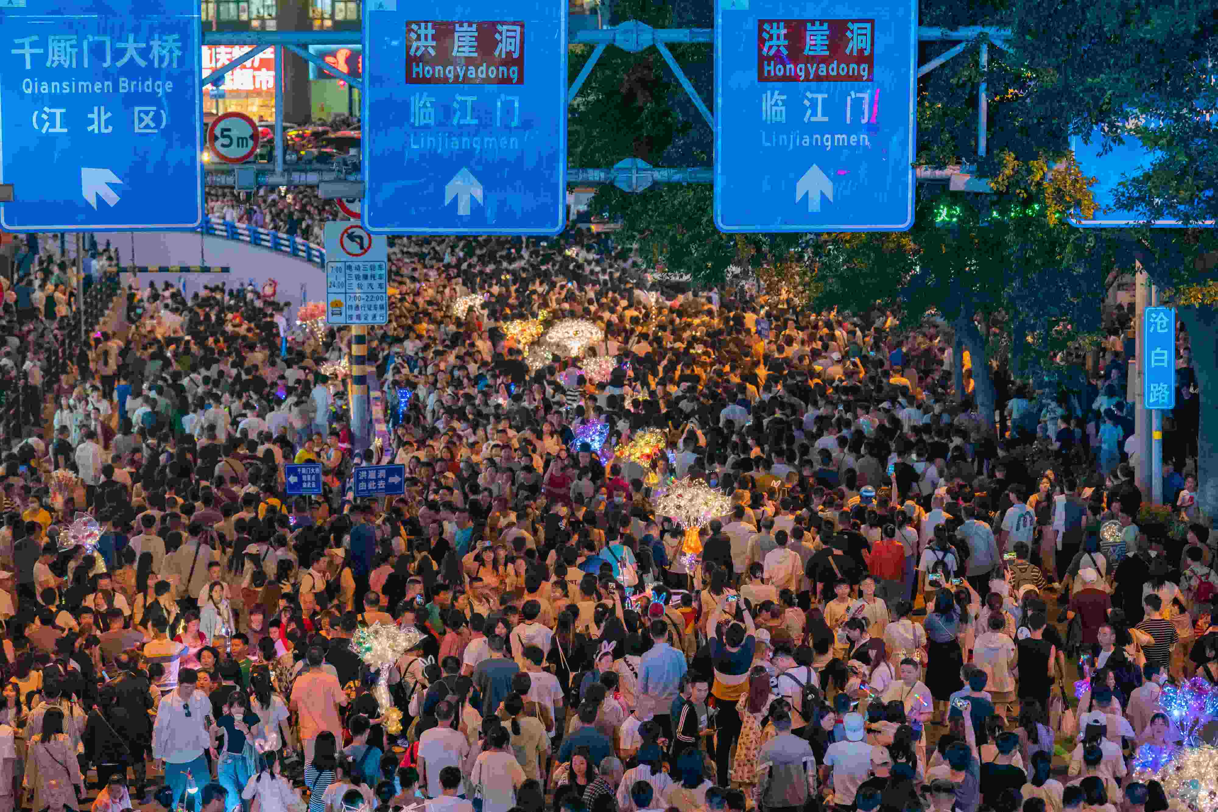 2023年4月30日,重慶,洪崖洞等熱門景點(diǎn)迎來游客高峰,千廝門大橋等多條主干道開啟實(shí)行交通管制,方便游客出行。 視覺中國(guó)