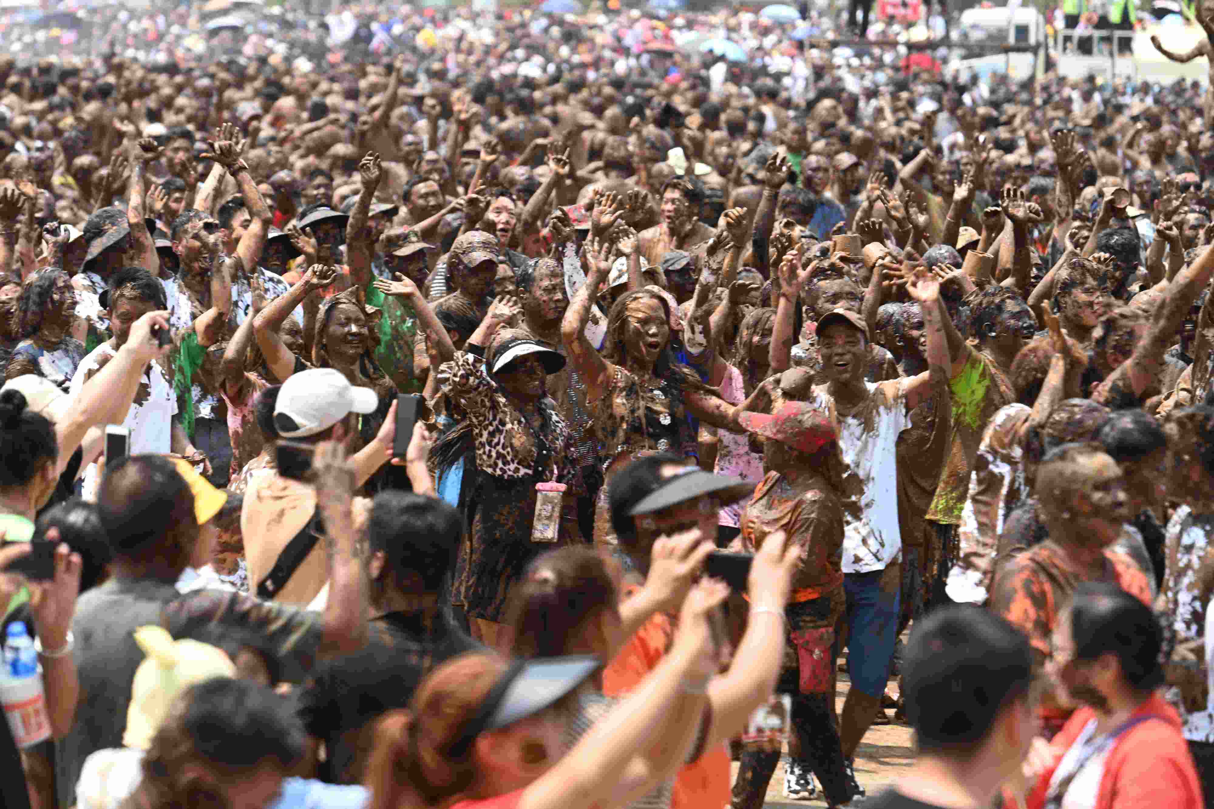 2023年4月30日,云南臨滄,游客相互抹泥表示祝福。當(dāng)日,2023年中國(guó)佤族司崗里摸你黑狂歡節(jié)在云南省臨滄市滄源佤族自治縣啟幕。人們用天然原料“娘布洛”配置而成的涂料相互涂抹表示祝福,摸得越黑,代表快樂(lè)幸福越長(zhǎng)久。 視覺(jué)中國(guó)