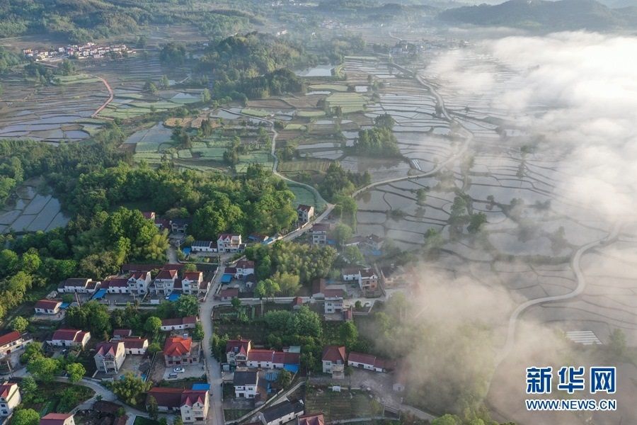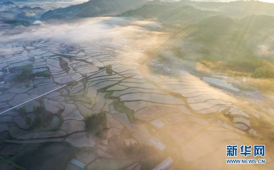 春日清晨,航拍安徽省宣城市旌德縣興隆鎮(zhèn)三山村,線(xiàn)條優(yōu)美的梯田、若隱若現(xiàn)的村莊、濃淡相宜的云霧、變幻莫測(cè)的朝霞,描繪出一幅幅美麗的鄉(xiāng)村畫(huà)卷。